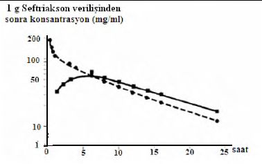 Bolus intravenöz enjeksiyondan sonra ortalama pik konsantrasyonlar, 500 mg’lık dozu takiben yaklaşık olarak 120 mg/1 ve 1 gramlık dozu takiben yaklaşık olarak 200 mg/l’dir; 30 dakikalık 2 gramlık infüzyondan sonra ortalama 250 mg/l’lık düzeyler elde edilir, %1.06’lık lidokainde 500 mg seftriaksonun intramüsküler enjeksiyonu, 1 saat içinde 40-70 mg/l’lık ortalama pik plazma konsantrasyonlan oluşturur. İntramüsküler enjeksiyondan sonra biyoyararlanım %100’dür.