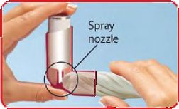 6. Aldığınız nefesi bir süre tutun, bu sırada inhaleri ağzınızdan çıkarın ve işaret parmağınızı inhalerin üzerinden çekin. Nefesinizi 10 saniye kadar veya daha uzun süre tutun. Yavaşça nefesi dışarı verin. İnhalerin içine nefes vermekten kaçının.
