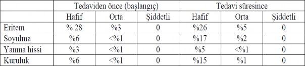 Çok yaygın: Eritem, soyulma, kuruluk (genellikle hafif şiddette bildirilmiştir) Yaygın: Yanma hissi