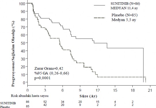 Günde 15 mg/m2 ila 30 mg/m2 arasında değişen dozlarda 4/2 şemasına göre sunitinib alan, yaşları 13-16 arasında değişen GİST'i olan 6 pediyatrik hastada oral sunitinibin bir faz 1/2 çalışmasından elde edilen kanıtlar ve mevcut yayınlanmış veriler (GİST'i olan 20 pediyatrik veya genç erişkin hasta) sunitinib tedavisinin, 26 hastadan 18'inde (%69,2) hem imatinib yetersizliğinden veya intoleransından sonra (21 hastadan 16'sında stabil hastalık) hem de novo/cerrahi ameliyat sonrasında (5 hastadan 2'sinde stabil hastalık) hastalık stabilizasyonu sağladığı gözlenmiştir. Faz 1/2 çalışmasında, 6 hastanın 3'ünde stabil hastalık ve 3'ünde hastalık ilerlemesi gözlenmiştir (sırasıyla 1 hastaya neo adjuvan ve 1 hastaya adjuvan imatinib verilmiştir). Aynı çalışmada, 6 hastanın 4'ünde (%66,7) Grade 3-4 tedaviye bağlı advers olaylar (Grade 3 hipofosfatemi, nötropeni ve trombositopeninin her biri 1 hastada ve 1 hastada Grade 4 nötropeni) görülmüştür. Ek olarak, yayınlar, 5 hastada gözlenen şu Grade 3 advers ilaç reaksiyonları bildirmiştir: Yorgunluk (2), gastrointestinal advers ilaç reaksiyonları (diyare dahil) (2), hematolojik advers ilaç reaksiyonları (anemi dahil) (2), kolesistit (1), hipertiroidizm