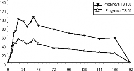 Transdermal Salım Sistemi | Günlük salım oranı mg/gün | Uygulama yeri | EAA(0-t- son) ngxh/ml / nmolxh/l | Cmaks pg/ml / pmol/l | C ort pg/ml / pmol/l | tmaks saat | Cmin pg/ml / pmol/l |