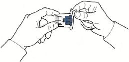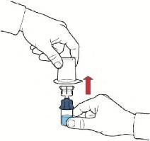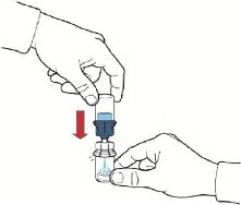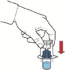 7. Aparat kutusunu baş aşağı çeviriniz ve çözücü flakon tıpasına doğru plastik sivri ucu yerleştiriniz, böylece aparatın mavi kısmı çözücü flakona bağlanmış olur (Şekil B);