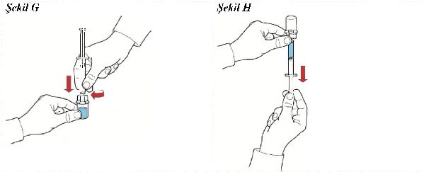 1. Şırıngayı hava ile doldurunuz, pistonu geri çekiniz, aparata tutturunuz ve havayı sulandırılmış çözeltiyi içeren toz flakonun içine enjekte ediniz ( Şekil G);