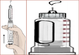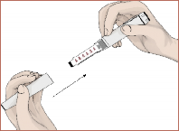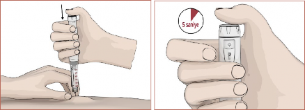 Başparmak ve işaret parmak arasında enjeksiyon yerinin cilt ve yağ dokusunun bir kısmını sıkıştırın. Diğer elinizle, baş parmağınızı enjeksiyon düğmesinin üzerine koyun ve iğneyi sıkışmış deriye batırın. Enjeksiyon düğmesini yavaş yavaş ve güçlü bir şekilde, duruncaya kadar aşağıya bastırın. Durduktan sonra düğmeyi 5 saniye süreyle basılı tutun ve ardından iğneyi deriden dışarıya çekin.