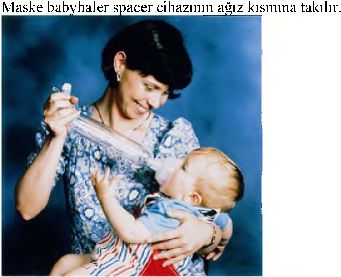 Babyhaler spacer cihazının maskeli kısmı çocuğun ağız ve burnunu iyice içine alacak şekilde yerleştirilir.