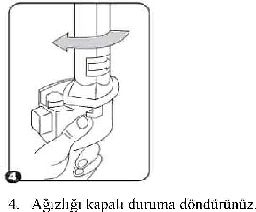 2. İnhalerin tabanını sıkıca tutup, ağızlığı ok yönünde döndürerek açınız. r--7—\
