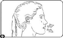 7. Ağızlığı ağzınıza yerleştiriniz ve başınızı hafifçe geriye doğru eğiniz. Dudaklarınızla ağızlık etrafını sıkıca sarınız ve hızla ve alabildiğiniz kadar derin soluk alınız. Kapsülün aletin odacığında dönmesinden, tozun dağılmasından kaynaklanan vızıldama sesini duymalısınız. Eğer bu vızıldama sesini duymadıysanız, kapsül odacıkta sıkışmış olabilir; bu durumda inhaleri açınız ve kapsülü odacıkta sıkışmış olduğu yerden kurtarınız. Kapsülü kurtarmak için kırmızı düğmelere tekrar tekrar BASMAYINIZ.
