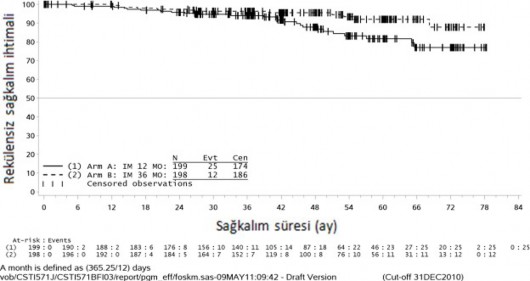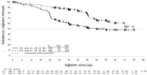 36 aylık imatinib tedavisi, 12 aylık imatinib tedavisi ile karşılaştırıldığında RFS'de anlamlı ölçüde uzama sağlamıştır (genel tehlike oranı (HR) = 0,46 [0,32, 0,65], p<0,0001) (Tablo 7, Şekil 1).