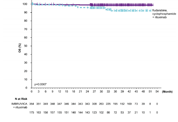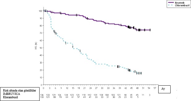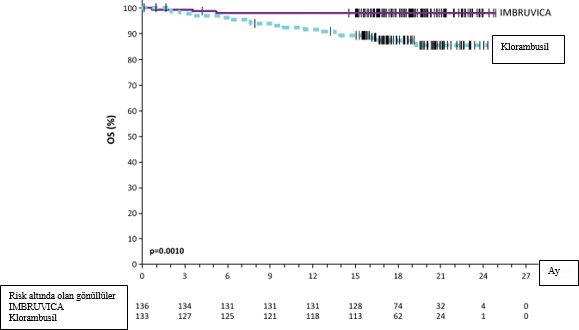 Genel sağkalım verileri henüz olgun değildir. 28 aylık medyan takipte, toplam 23 ölümle tedavi kolları arasında anlamlı fark yoktur: IMBRUVICA + venetoklaks kolunda 11 (%10,4) ve klorambusil + obinutuzumab kolunda 12 (%11,4) OS HR 1,048 [%95 GA (0,454, 2,419)].