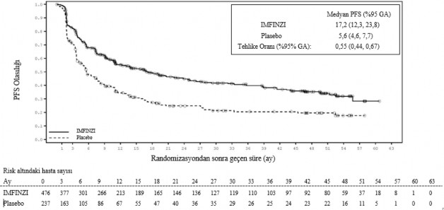 Performans durumu 0-1 olan yaygın evre küçük hücreli akciğer kanseri (YE-KHAK) erişkin hastalarının birinci basamak tedavisinde 4 kür etoposid ve karboplatin ya da sisplatin ile kombinasyon ve ardından idame monoterapi olarak progresyona kadar IMFINZI endikedir.