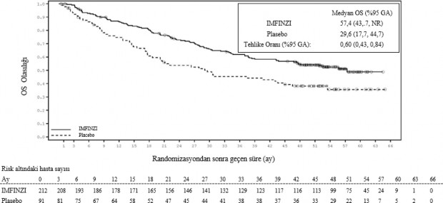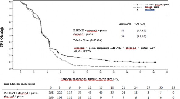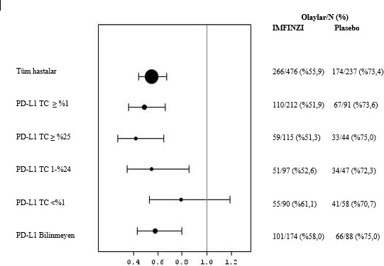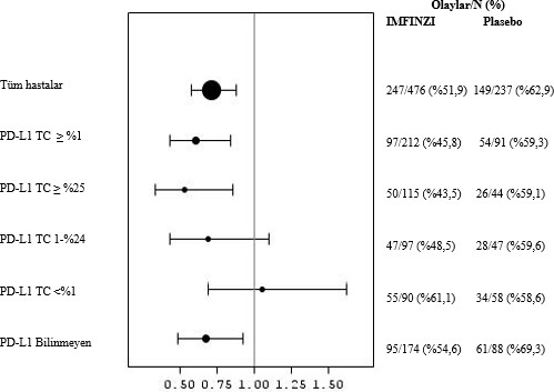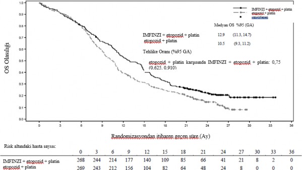 Tek başına etoposid + platin alanlara kıyasla IMFINZI + etoposid + platin alan hastalar için OS'deki olumlu gelişmeler, demografik özellikler, coğrafi bölge, karboplatin veya sisplatin kullanımı ve hastalık özelliklerine göre önceden belirlenmiş alt gruplar arasında tutarlı bir şekilde gözlenmiştir.