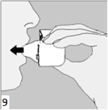 9. İnhalasyon cihazının ağzını açıp, cihazı ağzınıza kadar kaldırınız ve dudaklarınızı ağızlık parçasının çevresinde sıkıca kapayınız. Başınızı dik bir şekilde tutarak, yavaş ve derin bir nefes alınız; nefes alma hızınızı, kapsülün titreştiğini algılayacak şekilde ayarlayınız. Akciğerleriniz doluncaya kadar nefes alınız; nefesinizi sizi zorlamayacak bir süreyle tutunuz ve bu esnada inhalasyon cihazını ağzınızdan çıkarınız. Şimdi normal nefes alıp vermeye başlayabilirsiniz.