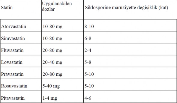 Siklosporin; CYP3A4, çoklu ilaç dışa akış (eflü) taşıyıcısı P-glikoprotein ve organik anyon taşıyıcı proteinlerinin (OATP) inhibitörüdür ve bu enzim ve/veya taşıyıcının substratları olan, eşzamanlı uygulanan maddelerin plazma düzeylerini yükseltebilir. Siklosporin ile bu tür ilaçlar bir arada uygulanırken dikkatli olunmalıdır ya da eşzamanlı uygulamadan kaçınılmalıdır (bkz. Bölüm Diğer tıbbi ürünler ile etkileşimler). Siklosporin, HMG-CoA redüktaz inhibitörlerine (statinler) maruziyeti artırır.Siklosporin ile bir arada uygulandıklarında statinlerin dozajı düşürülmelidir ve etiketlerindeki öneriler doğrultusunda belirli statinler ile eşzamanlı uygulamadan kaçınılmalıdır. Miyopati belirti ve semptomları olan hastalarda ya da şiddetli böbrek hasarına yatkınlığa sebep olan rabdomiyolize sekonder böbrek yetmezliği gibi faktörleri olan hastalarda statin tedavisinin geçici olarak durdurulması gerekir (bkz. Bölüm Diğer tıbbi ürünler ile etkileşimler).