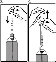 Şırınganın uç kısmını tıpanın ağız kısmına sokun (Şekil 5). Reçetelenmiş miktarda solüsyonu şişeden çekin (Şekil 6).