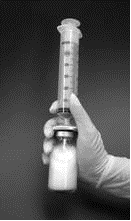 9 mg/mL (% 0.9) enjeksiyonluk sodyum klorür çözeltisi, enjektörün pistonuna yavaş ve sıkı bir şekilde bastırılarak flakona ilave edilir. Filtre ve enjektör, flakondan çıkarılmamalıdır.