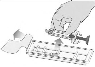 Plastik tepsinin üstündeki koruyucu filmi sökünüz ve iğne ile şırıngayı çıkarınız, şırıngayı bırakma klipslerine dokunmadan ortasından tutunuz.