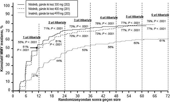 Kaplan-Meier tahminlerine dayalı olarak, TSY'ye ulaşan hastalar arasında yanıtını 72 ay süreyle sürdüren hastaların oranları, günde iki kez 300 mg nilotinib grubunda %99,1 (%95 GA: