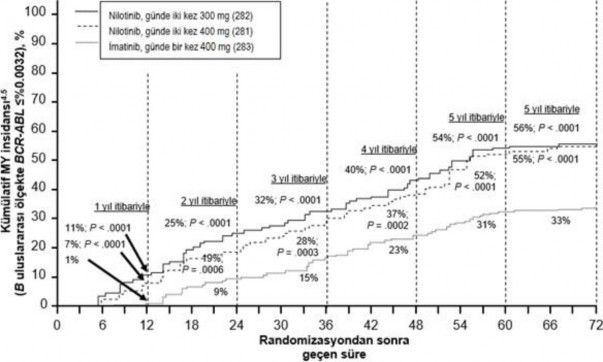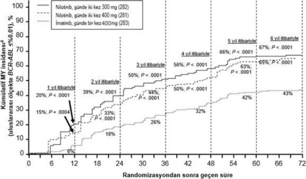 Birinci veya ikinci basamak tedavi olarak nilotinib almış olan hastalarda majör moleküler yanıt kaybının (MMY=BCR-ABL/ABL ≤0.1 %IS) ya da ikinci basamak tedavi olarak nilotinib almış olan hastalarda doğrulanmış MY4 (MY4=BCR-ABL/ABL ≤0.01 %IS) kaybının (aralarında en az 4 haftanın olduğu arka arkaya iki ölçümün MY4 (MY4=BCR-ABL/ABL