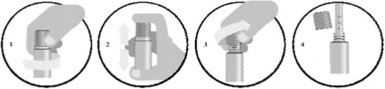 Şekil 1. Kapağı emniyet halkası kırılana kadar Şekil l’deki gibi çeviriniz. Kapağın içindeki sodyum bikarbonat içeren piston, otomatik olarak tıpayı delerek sodyum bikarbonatın flakondaki sıvıya karışmasını sağlayacaktır.