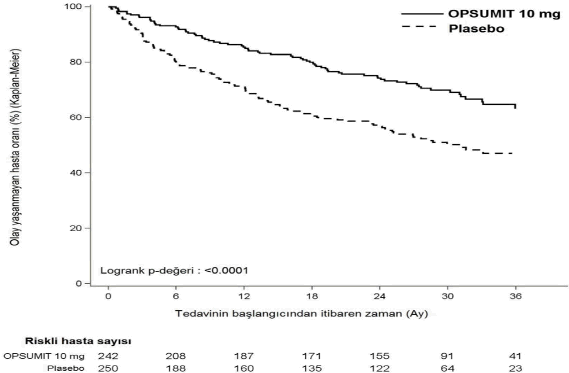 %44,6'sı ve masitentan 10 mg alan hastaların %29,4'ü (Mutlak Risk Azalması = %15,2) PAH nedeniyle hastaneye yatırılmış veya PAH'a bağlı bir nedenden ölmüştür.