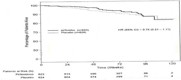 PIPF-004 ve PIPF-006'dan elde edilen havuzlanmış hayatta kalma analizinde, ölüm oranı pirfenidon 2403 mg/gün grubunda %7,8 iken, plasebo alan grupta% 9,8 olarak hesaplanmıştır (HR 0,77 [%95 CI, 0,47-1,28]).