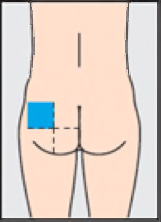 Kas içine uygulanırken: Enjeksiyon bir doktor veya hemşire tarafından yapılmalıdır. PREGNYL için en uygun enjeksiyon noktası kaba etinizin kaslı kısmıdır. Aşağıdaki şekilde kaba ette kan damarı veya önemli sinirlerin olmadığı kısım maviyle gösterilmiştir.