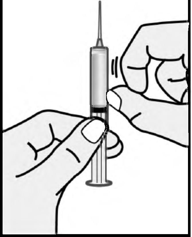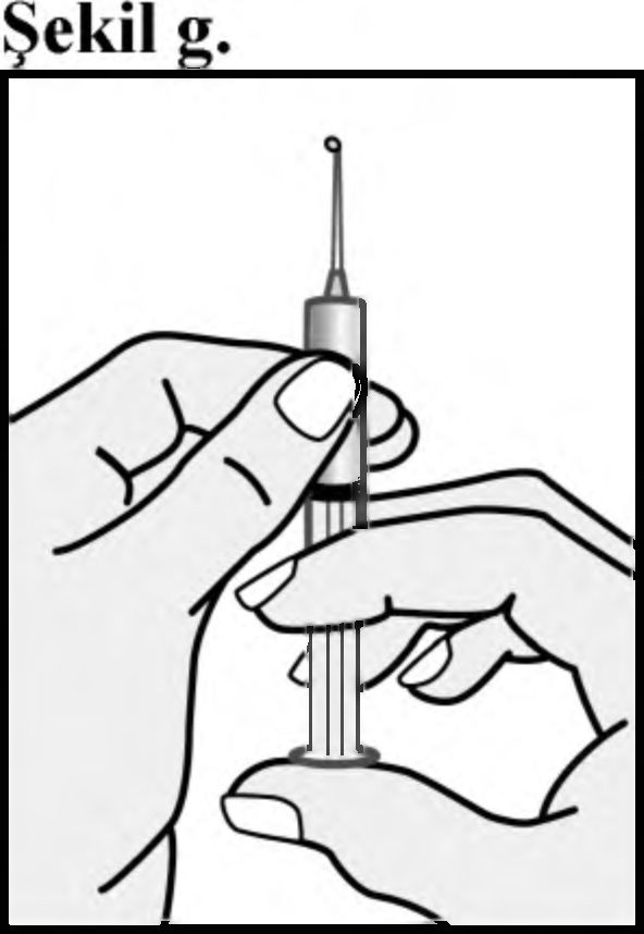 Enjektörü iğne ucu yukarı gelecek şekilde tutarak yan tarafından hafifçe vurun, içerisindeki hava baloncukları yukarı doğru çıkacaktır (şekil f).