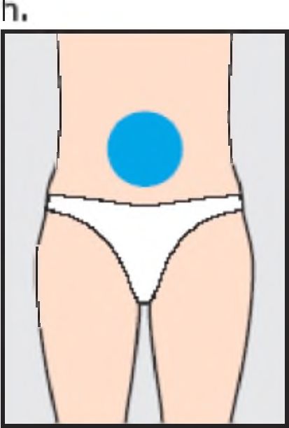 Enjeksiyon için en uygun bölge kamınızda gevşek deri ve yağ tabakalarının bulunduğu göbeğinizin orta kısmıdır (şekil h). Derinin büyük bir kısmını işaret parmağınızla başparmağınız arasında sıkın. Her yeni enjeksiyonda iğne yaptığınız bölgeyi değiştirmeniz gerekir. Başka bölgelere enjeksiyon yapmanız mümkündür. Doktorunuz veya hemşireniz nereye enjeksiyon yapabileceğinizle ilgili tavsiyede bulunacaktır.