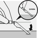 Flakon sert bir yüzeye konur ve altından tutulur. Flakon adaptörü gri kauçuk tıpa üzerinde ortalanır. Flakon adaptörü, yerine sabit bir şekilde oturana kadar flakonun üzerine doğru bastırılır.