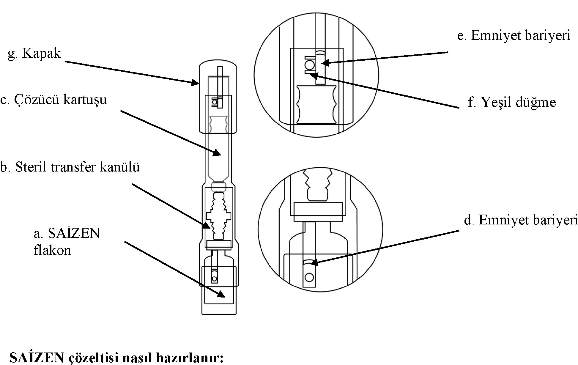 SAİZEN’in uygulanmasıKartuşun one.click oto-enjektörüne nasıl yerleştirileceği ya da coo1.click iğnesiz oto-enjektör ya da easypod oto-enjektörün nasıl kullanılacağı ve rekonstitüye SAİZEN çözeltisinin nasıl enjekte edileceğine dair talimatlar için lütfen herbir oto-enjektör ile sunulan kullanma talimatını okuyunuz. Easypod’un tasarlanan kullanımı öncelikle 7 yaş üstü çocuklar ve yetişkinlerdir. Çocuklar tarafından cihazların kullanımı yetişkinlerin gözetimi altında yapılmalıdır.