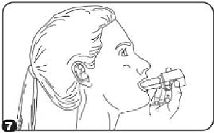 7. Ağızlığı ağzınıza yerleştiriniz ve başınızı hafifçe geriye doğru eğiniz. Dudaklarınızla ağızlık etrafını sıkıca sarınız ve hızla ve alabildiğiniz kadar derin soluk alınız. Kapsülün aletin odacığında dönmesinden, tozun dağılmasından kaynaklanan vızıldama sesini duymalısınız. Eğer bu vızıldama sesini duymadıysanız, kapsül odacıkta sıkışmış olabilir; bu durumda inhaleri açınız ve kapsülü odacıkta sıkışmış olduğu yerden kurtarınız.