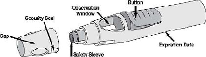Cap = Kapak Security Seal = Güvenlik Mührü Observation Window = Gözlem Penceresi Buton = Düğme Safety Sleeve = Güvenlik Kılıfı Expiretion Date = Son Kullanma Tarihi