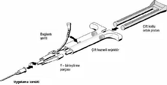 - Bağlantı şeridi çift hazneli enjektöre iliştirilerek, birleştirme parçası sabitlenir. Şeridin kopması durumunda yedek birleştirme parçası kullanılır. Yedek parçadaki şeridin de kopması durumunda ürün yine de kullanılabilir ama sızıntı olmaması için bağlantının sağlamlığı iyice kontrol edilmelidir.