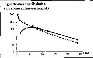 İntravenöz uygulamada, seftriakson interstisyel sıvıya süratle difiize olur ve duyarlı organizmalara karşı 24 saat süren bakterisid konsantrasyonlar sağlanır (şekle bakınız).