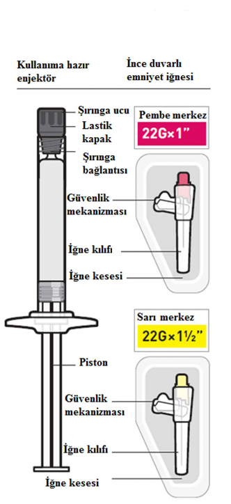 Piston tıpası, geri kaçış kilidi ve ince duvarlı 22G 1,5 inç (0,72 mm x 38,1 mm) emniyetli iğne ve ince duvarlı 22G 1 inç (0,72 mm x 25,4 mm) emniyet iğnesi takılı uç kapak (bromobutil lastik) ile birlikte kullanıma hazır dolu enjektör (siklik-olefin-kopolimer).