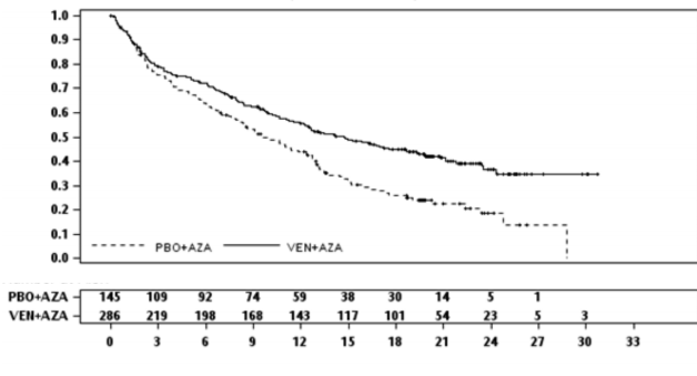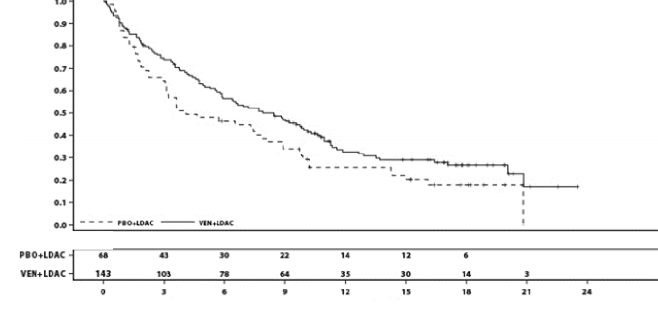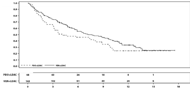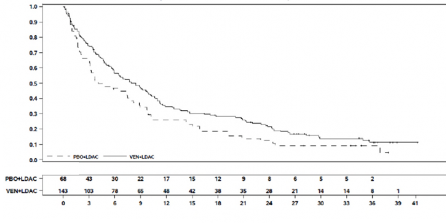 siklusun başlangıcına kadar CR+CRi oranı venetoklaks ve düşük doz sitarabin için %34 (%95 GA: 27, 43), plasebo ve düşük doz sitarabin için %3'tür (%95 GA: 0,4, 10). Venetoklaks ve düşük doz sitarabin tedavisinde ilk CR+CRi yanıtına kadar geçen medyan süre 1,1 aydır (aralık: 0,8 ila 4,7 ay). En iyi CR+CRi yanıtına kadar geçen medyan süre 1,2 aydır (aralık: 0,8 ila 5,9 ay).