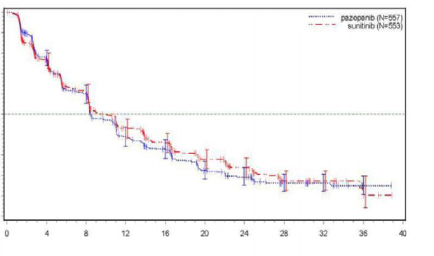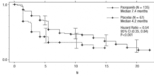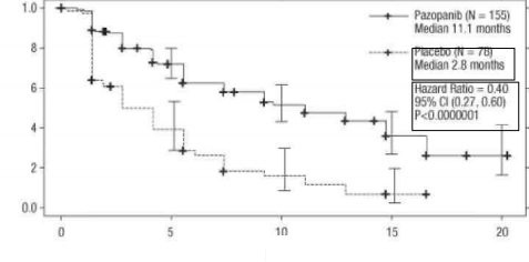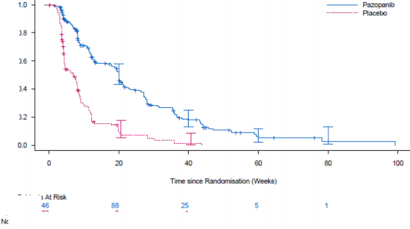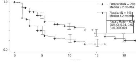 Plasebo kolu ile karşılaştırıldığında pazopanib kolunda, araştırmacı değerlendirmesine dayalı olarak PFS'de benzer bir iyileşme gözlenmiştir (genel ITT popülasyonunda HR: 0,39; % 95 GA, 0.30 ila 0.52, p <0.001).