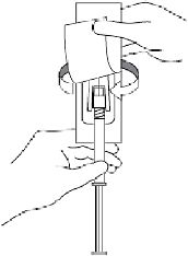 4. Güvenlik iğnesinin kabını yarıya kadar sıyırınız. Plastik sıyırma kabını kullanarak iğne kılıfını kavrayınız. Güvenlik iğnesini enjektörün cam şırınga bağlantısına saat yönünde çevirerek takınız.