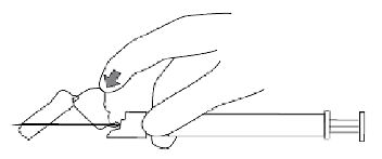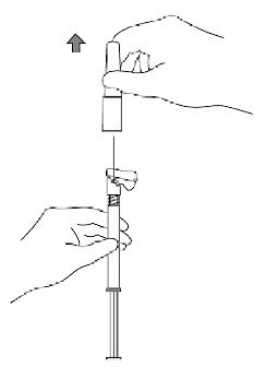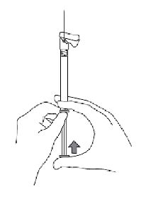 6. Havasını gidermek için, takılmış olan iğne ile birlikte enjektörü dik pozisyona getiriniz. Piston çubuğunu dikkatli bir şekilde ileri iterek enjektörün havasını gideriniz.