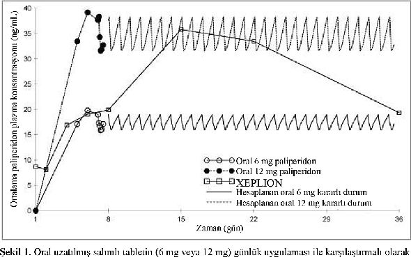 XEPLION, paliperidonu ayda bir uygulamak üzere tasarlanmıştır. Uzatılmış salımlı oral paliperidon ise günde bir kere uygulanır. Şekil 1, önerilen başlangıç rejimi kullanılarak XEPLION uygulamasını takiben 5 hafta süre ile paliperidonun ortanca farmakokinetik profilini, oral uzatılmış salımlı tablet (6 mg veya 12 mg) uygulaması ile karşılaştırmalı olarak sunmaktadır. XEPLION’un başlangıç rejimi (1. gün/8. günde deltoid kas içine 150 mg/100 mg), tedaviyi oral destek kullanmaksızın başlatırken kararlı durum paliperidon konsantrasyonlarına hızla ulaşmak üzere tasarlanmıştır.