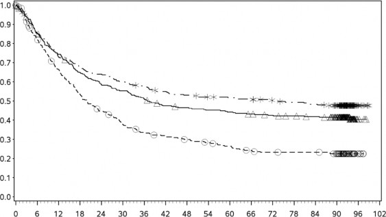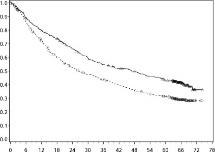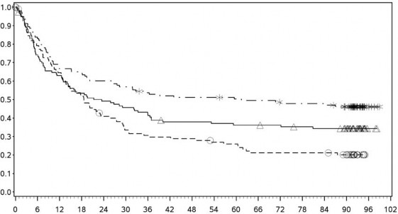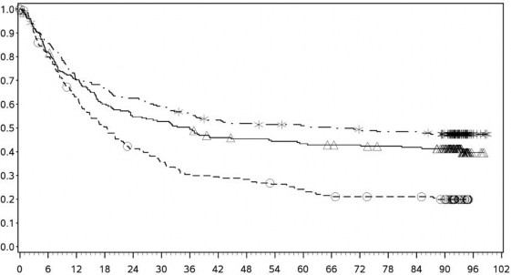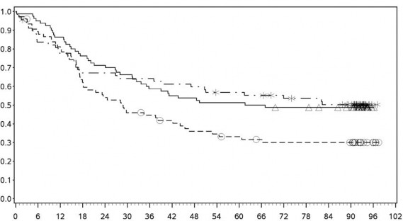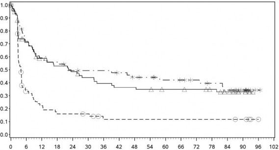 | ipilimumab + nivolumab (n = 57) | kemoterapi (n = 78) | ipilimumab + nivolumab (n = 232) | kemoterapi (n = 219) |